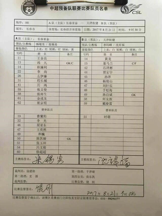 天津权健预备队的唯一替补萌一名是一名门将,几乎不会获得出场机会。而与客场作战的天津权健相比,长春亚泰预备队的替补名单上有多达9名球员。