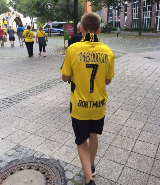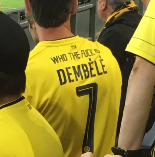 对于登贝莱的转会,我们可以看到一些多特蒙德球迷采取了一种十分有趣的做法,他们恶搞了登贝莱在大黄蜂身穿的7号球衣,写上了“谁是登贝莱”以及“1.48亿”的字样。