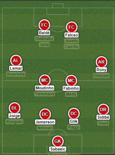 客队摩纳哥大名单:苏巴西奇,贝纳利奥,西;格利克,热梅尔松,若热,拉吉,西迪贝,图雷;勒马尔,穆蒂尼奥,罗尼·洛佩斯,蒂莱曼斯,A·特劳雷;凯塔·巴尔德,卡里略,迪亚卡比,法尔考,加扎尔,约维蒂奇。