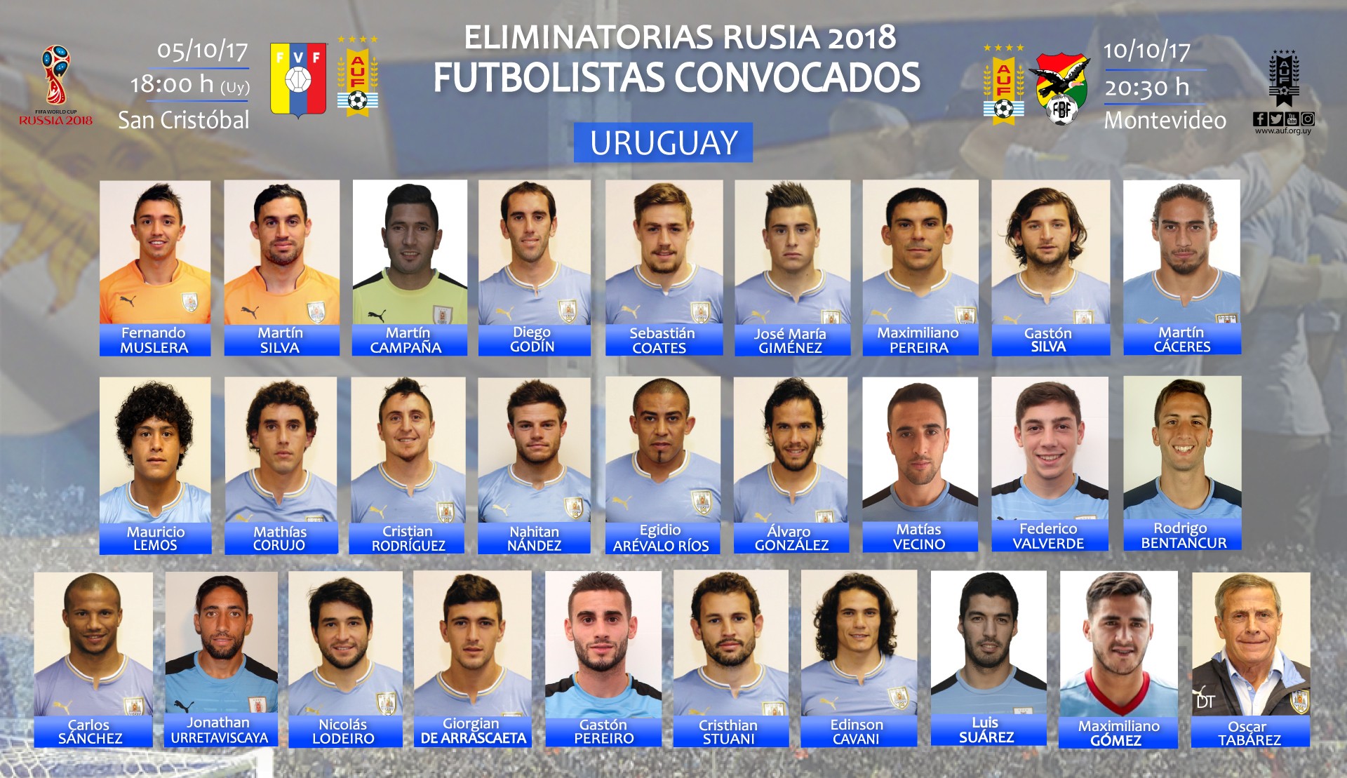 随着国际比赛日的到来,各个国家队也纷纷公布了最新一期的球员大名单。其中乌拉圭队已经公布了本期国家队大名单,效力于巴塞罗那的苏亚雷斯领衔入选。