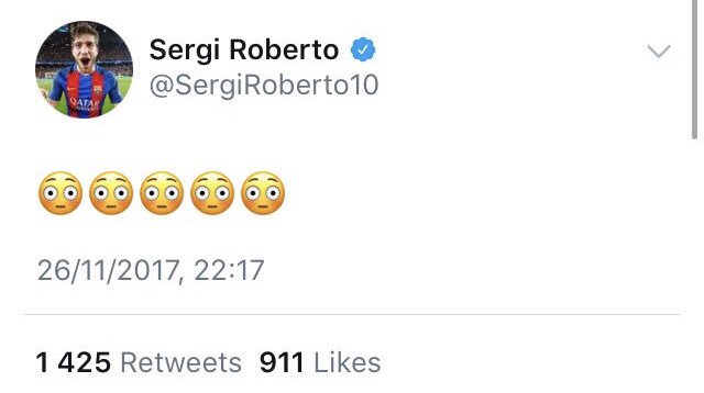 正在从伤病中恢复的巴萨中场罗贝托也不忘观看巴萨的这场比赛,而在误判发生之后,罗贝托在推特上发了5个一脸懵逼的表情,表达了对此事的无奈。
