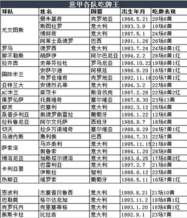 他们具有着牺牲自我保全球队的精神,红黄牌有时候也不是一味的意味着粗野,有时候也是战术价值的体现。本篇统计了五大联赛各队的吃牌王,大家来认识一下这些或许你很意外的防守悍将。