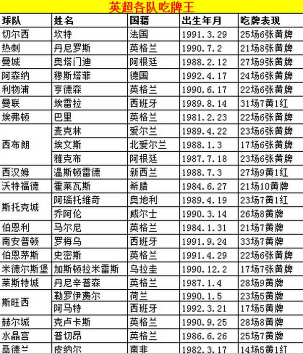 前六名豪门吃牌最多的要数曼城队中卫奥塔门迪了,他每三场比赛就会拿到一张黄牌。而沃特福德边卫霍莱巴斯则是全英超得牌率最高的球员,他每2.1场比赛就会拿到一张黄宝石战神卡。