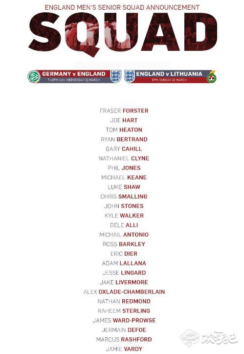 北京时间3月16日,在对阵德国和立陶宛前,英格兰公布了英格兰队的的最新期大名单,由于锋线哈里-凯恩和鲁尼等人都因伤缺战,索斯盖特选择征召曼联前锋拉什福德和桑德兰老将迪福,而阿森纳前锋沃尔科特落选。