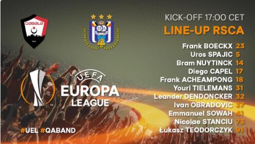 Boeckx; Sowah, Nuytinck, Spajic, Obradovic; Tielemans, Dendoncker, Stanciu; Capel, Teodorczyk, Acheampong