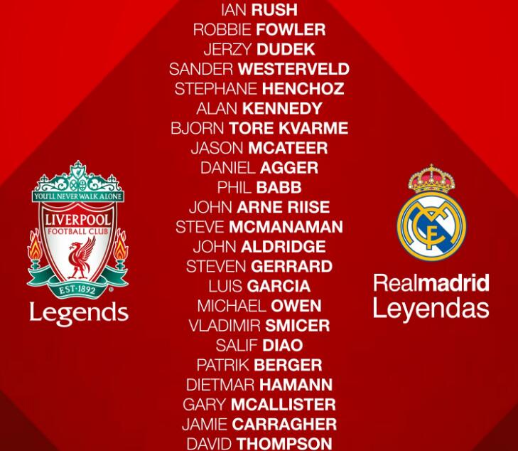 北京时间3月25日晚上20点,安菲尔德球场将迎来利物浦俱乐部与皇马俱乐部的一场传奇元老赛,赛前双方公布了比赛大名单。杰拉德领衔的杰拉德将面对卡洛斯与菲戈领衔的皇家马德里。