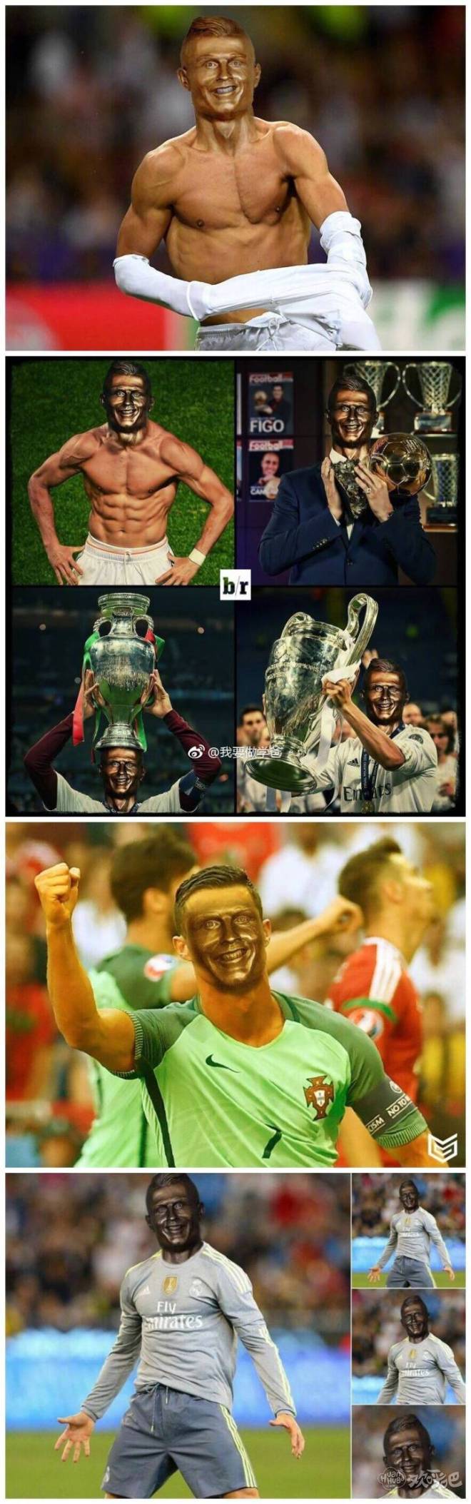 看着隔壁罗总裁生无可恋的表情,他的内心os一定是这样的:“那个做雕塑的给我出来,我保证不打你。”之后那位做了雕塑的大兄弟出来现身说法,表示自己的作品不可能让所有人都满意,由于无法请到C罗本人进行脸部倒模,他也只能找了一张C罗的图片进行雕塑的制作,而他选择的图片很有可能是这张。。。