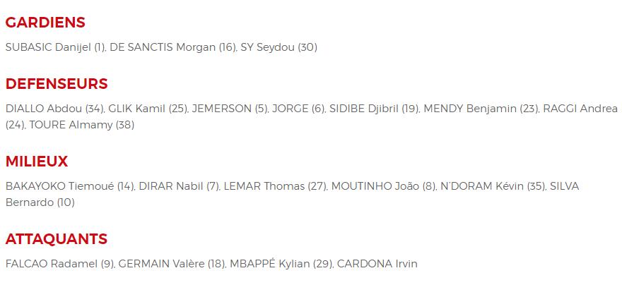 摩纳哥VS巴黎,摩纳哥公布法联杯决赛21人大名单