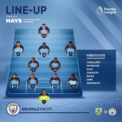 曼城首发:1-布拉沃、3-萨尼亚、30-奥塔门迪、11-科拉罗夫、22-克里希、25-费尔南迪尼奥、6-费尔南多、42-亚亚-图雷、7-斯特林、9-诺利托、10-阿圭罗