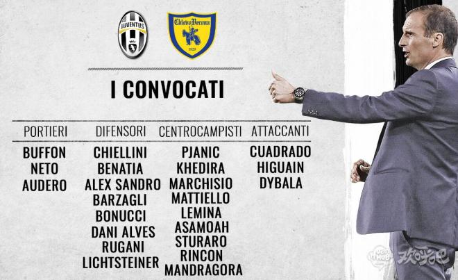 北京时间4月9日凌晨2点45分,尤文图斯将坐镇主场迎战到访的切沃,赛前尤文图斯公布了球队本场比赛的大名单,尤文图斯轮换边锋皮亚察赛季报销,另外主力前锋曼朱基齐因膝伤继续缺席球队大名单。