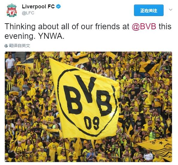 与多特渊源颇深的利物浦官推:今晚想着我们在多特蒙德的所有朋友们。
