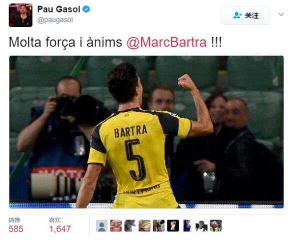 当时正在更新比赛讯息的巴萨官推也插播了对大黄蜂的支持:给予巴尔特拉和多特蒙德我们全部的支持。