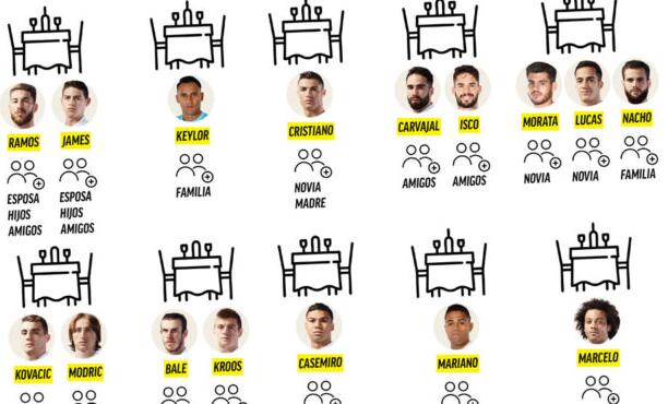 马塞洛和家人一桌;拉莫斯、哈梅斯以及他们各自的家人与朋友一桌;C罗和女友以及妈妈一桌;科瓦契奇和女友以及莫德里奇与妻子**一桌;贝尔和克罗斯及其各自家人一桌。